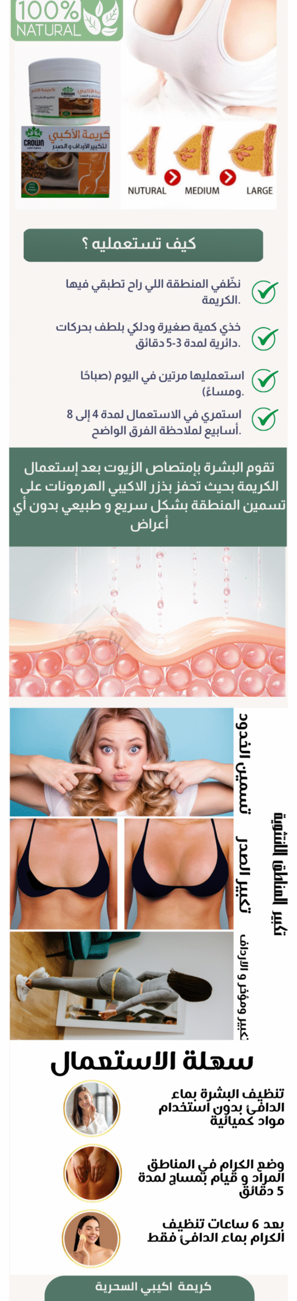 هي تركيبة طبيعية 100% مستخلصة من حبوب إفريقية نادرة، مصممة خصيصًا لتكبير وشد الصدر والأرداف بطريقة آمنة وفعّالة. غنية بمكونات تغذي البشرة، تزيد من نعومتها، وتحفّز إفراز الهرمونات الأنثوية بفضل الاستخدام المنتظم.